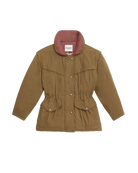 Parka bicolore en coton kaki et violine, col montant avec revers, fermeture éclair sur l'avant avec boutons pressions, épaules à revers, manches longues, taille resserrée avec coulisse, poches à rabats avec pressions, poche intérieure zippée coupe décontractée.